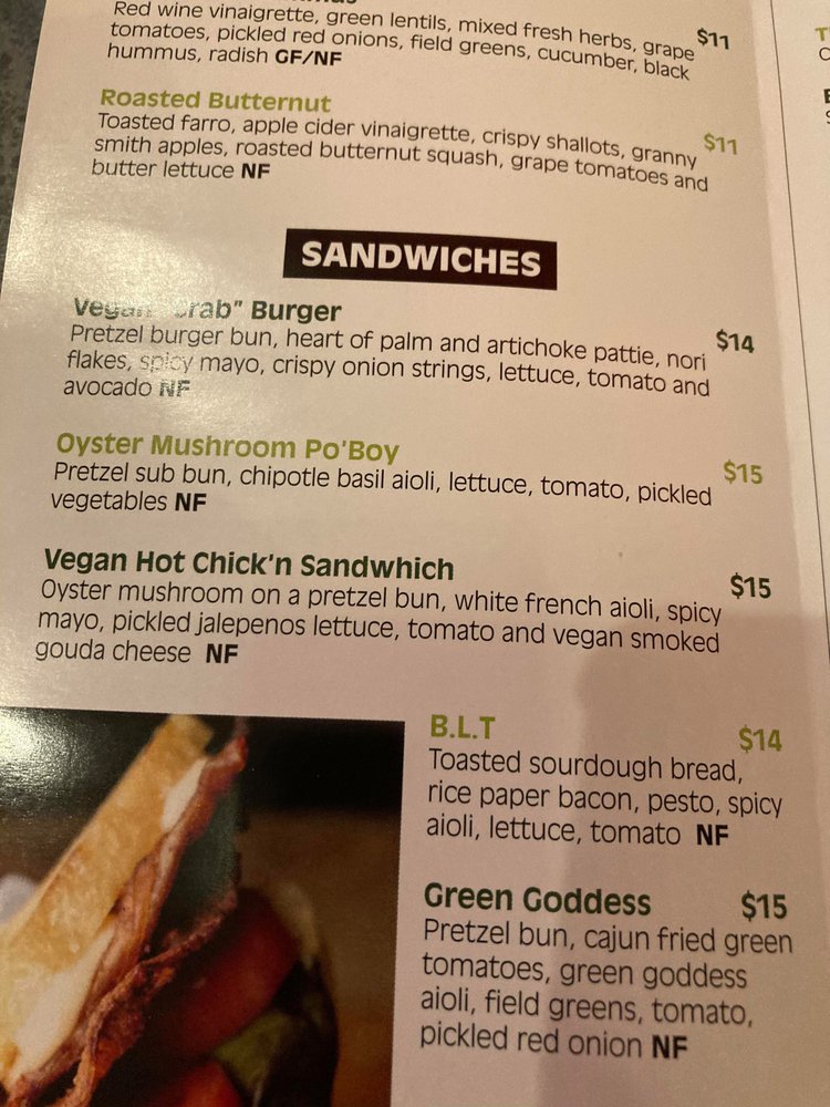 Sub bun, chipotle-basil aioli, lettuce, heirloom tomato, pickled cabbage, and crispy oyster mushrooms.*Nut Free