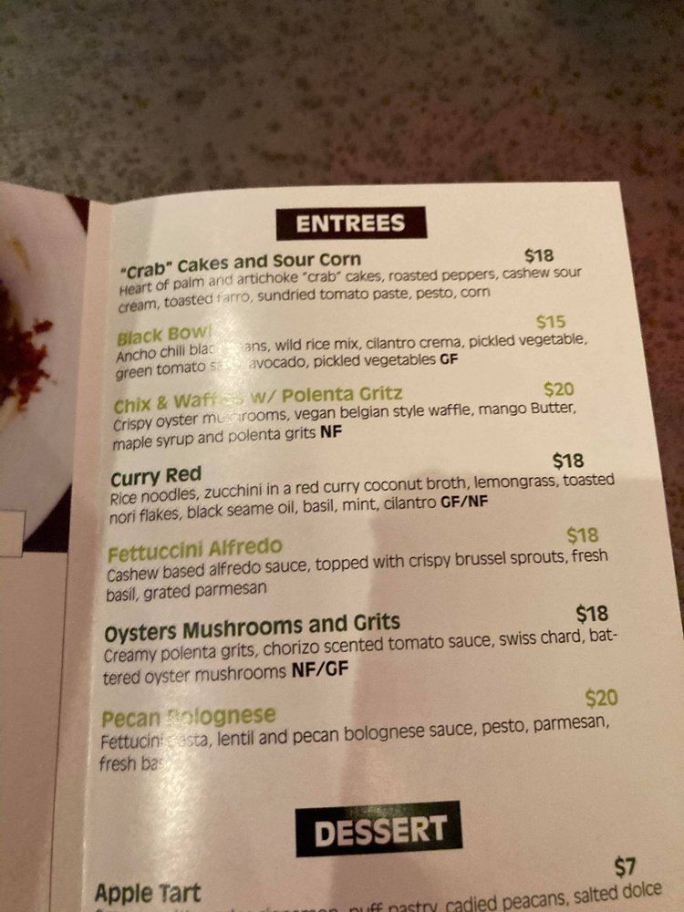 Spelt flour waffle, crispy oyster mushrooms, jalapeno hot sauce, mango butter, side of creamy polenta grits, maple syrup